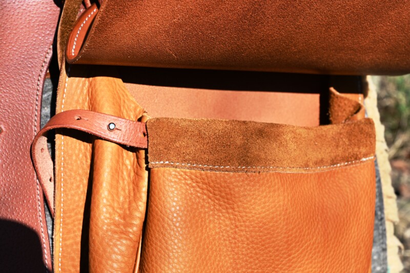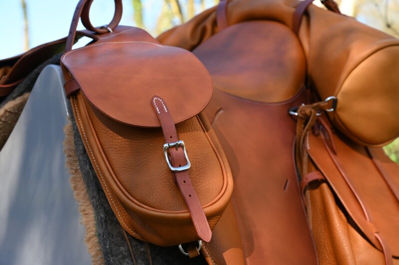 La selle de randonnée avec son arçon rallongé, couplé à un grand nombre de points d’attache permet de les arrimer bien plus facilement et efficacement que sur une selle dédiée à un autre usage.